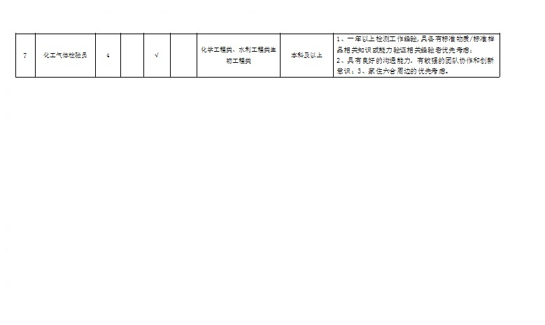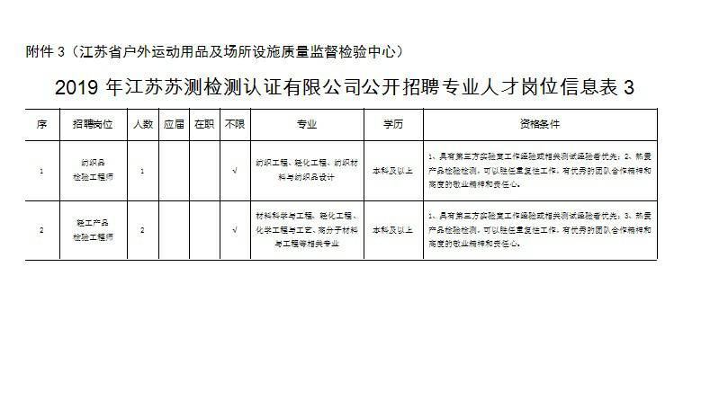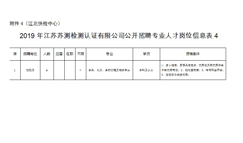 根據(jù)工作需要,江蘇蘇測(cè)檢測(cè)認(rèn)證有限公司(南京市產(chǎn)品質(zhì)量監(jiān)督檢驗(yàn)院全資子公司)委托中智江蘇經(jīng)濟(jì)技術(shù)合作有限公司面向社會(huì)公開(kāi)招聘24名《2019年江蘇蘇測(cè)檢測(cè)認(rèn)證有限公司公開(kāi)招聘專業(yè)人才公告》崗位工作人員,工作地點(diǎn)覆蓋南京市,確定聘用后根據(jù)工作需要統(tǒng)一安排,現(xiàn)將有關(guān)事項(xiàng)公告如下: 一、招聘崗位及人數(shù) 江蘇蘇測(cè)檢測(cè)認(rèn)證有限公司包括水泥制品檢驗(yàn)員、分析檢驗(yàn)員、環(huán)境檢驗(yàn)員、木材檢驗(yàn)員、機(jī)械檢驗(yàn)員、化工氣體主管、化工氣體檢驗(yàn)員、智能裝備/產(chǎn)品檢驗(yàn)檢測(cè)、智能裝備/產(chǎn)品檢驗(yàn)檢測(cè)及科研、紡織品檢驗(yàn)工程師、輕工產(chǎn)品檢驗(yàn)工程師等崗位共招聘24人。 二、資格條件 1.具有中華人民共和國(guó)國(guó)籍,擁護(hù)黨的路線、方針、政策; 2.遵紀(jì)守法,品行端正,具有良好的職業(yè)道德; 3.無(wú)違法違紀(jì)行為,具備正常履行工作職責(zé)的身體條件; 4.具備崗位資格條件(詳見(jiàn)附件:《2019年江蘇蘇測(cè)檢測(cè)認(rèn)證有限公司公開(kāi)招聘專業(yè)人才崗位信息表》) 三、簡(jiǎn)歷投遞方式 報(bào)名方式:本次招聘采取電子郵件報(bào)名方式。電子郵件報(bào)名時(shí),請(qǐng)將郵件主題及應(yīng)聘文檔按“2018年江蘇蘇測(cè)工作人員招聘材料+姓名+崗位”格式命名。 四、聘者需填寫個(gè)人簡(jiǎn)歷或者附件5-《2019年江蘇蘇測(cè)檢測(cè)認(rèn)證有限公司勞務(wù)外包項(xiàng)目報(bào)名表》,并提交求職材料。求職材料包含:(1)登記表或個(gè)人簡(jiǎn)歷上填寫內(nèi)容的證明材料(身份證、畢業(yè)證、學(xué)位證、職稱證、主要科研成果證明及獲獎(jiǎng)證書等材料原件掃描件/復(fù)印件);(2)有海外學(xué)習(xí)工作經(jīng)歷的需提供留學(xué)回國(guó)證明、學(xué)歷認(rèn)證等材料原件掃描件/復(fù)印件。(3)應(yīng)聘崗位所需提供的其他材料原件及復(fù)印件。 應(yīng)聘者請(qǐng)將個(gè)人簡(jiǎn)歷或者附件5-《2019年江蘇蘇測(cè)檢測(cè)認(rèn)證有限公司勞務(wù)外包項(xiàng)目報(bào)名表》及應(yīng)聘證明材料原件掃描并制作成一份PDF格式材料后,發(fā)送至郵箱:617025593@qq.com,相關(guān)咨詢電話:025-86673817 凌老師(工作日9:00-17:00,節(jié)假日除外)。 五、資格審查 1.初審。根據(jù)應(yīng)聘者提供的各種求職材料進(jìn)行資格審查,應(yīng)聘者提供的應(yīng)聘材料須真實(shí)準(zhǔn)確,一經(jīng)發(fā)現(xiàn)應(yīng)聘材料存在虛假不實(shí)之處,經(jīng)核實(shí),取消應(yīng)聘者應(yīng)聘資格,責(zé)任由應(yīng)聘人員自行承擔(dān)。 2.復(fù)審?,F(xiàn)場(chǎng)對(duì)初審合格的應(yīng)聘者提供的各種求職材料原件進(jìn)行資格審查,交驗(yàn)證明材料原件。符合要求的準(zhǔn)許參加面試,不符合要求的取消其面試資格。 六、筆試、面試 符合資格審查的候選人,將統(tǒng)一組織開(kāi)展筆試、面試,進(jìn)行擇優(yōu)選取。 七、體檢、錄用 根據(jù)崗位需要,經(jīng)考試、政審、體檢合格后確定聘用候選人。通過(guò)中智江蘇經(jīng)濟(jì)技術(shù)合作有限公司實(shí)行勞務(wù)外包管理。